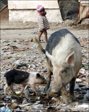 Селяни з бідних районів навколо індійських міст часто тримають домашню худобу. М"ясо і молоко — один із основних способів їхнього заробітку. Нерідко тварини пасуться за кілька кроків від дітей, які граються на землі.