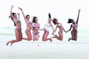 Зліва направо підскакують учасниці конкурсу краси "Міс Всесвіт 2011" Дагмар Koлесарова зі Словаччини, Адріана Дім із Нікарагуа, Валерія Алейникова з Казахстану, Карін Онтіверос із Мексики, Келі Гомес із Гондурасу, Гілан Беррі з острова Аруба під час фотосесії на пляжі біля бразильського міста Ґуаружа.