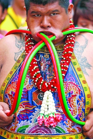 Тайці у цей день відмовляються від м'яса, алкоголю і сексу. 27-річний Ань Ла Уль проколов собі щоки двома гострими списами. По них тече кров.