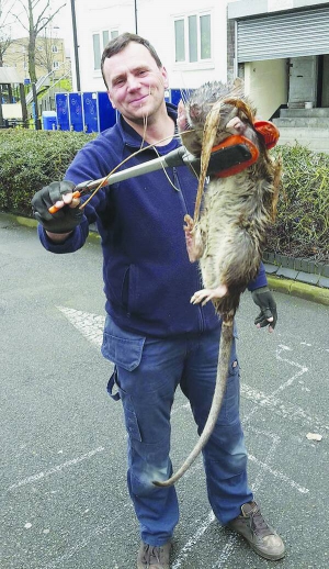 Інженер газового обладнання Тоні Сміт тримає щура біля дитячого майданчика на півночі британської столиці Лондона. Гризун важить понад 11 кг. Довжина від голови до хвоста — 1,2 м. Мертву тварину знайшли в кущах під час роботи у багатоквартирному будинку.