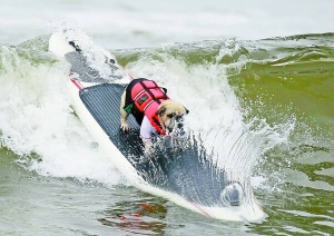 Бульдог змагається за перемогу в чемпіонаті з собачого серфінгу на пляжі Хантінґтон в американській Каліфорнії. За два дні в запливі взяли участь 24 собаки.