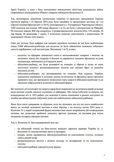 "Каким было наше удивление и возмущение, когда мы узнали, что во время своего ознакомительного визита к позициям указанной части в конце марта – начале апреля 2014 года г. Колесник И.И. в крайне уничижительной форме выразил свое полное непринятие действий командования части, которое позволило принять помощь простых граждан, и высказал ряд других замечаний в адрес офицеров части", - говорится в письме.