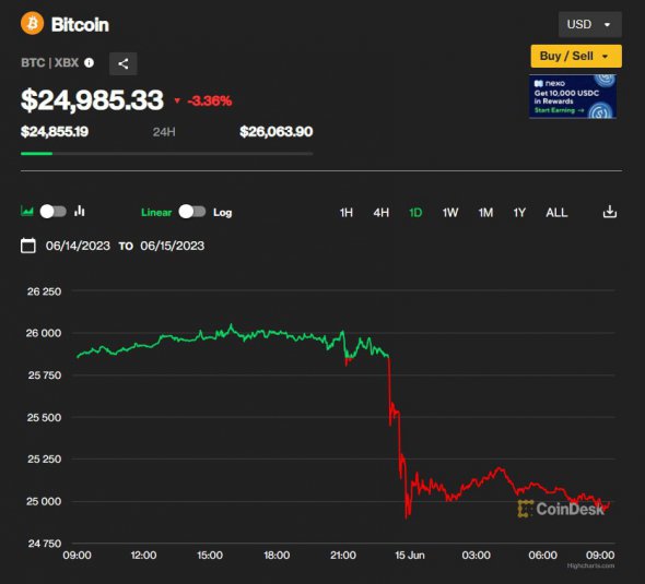 "Падіння відбулося через три години після того, як Федеральна резервна система оголосила про призупинення зростання відсоткових ставок після майже 15-місячного підвищення в боротьбі з інфляцією. Протягом останнього тижня біткоїн тримався на позначці $26 тис., попри судові позови SEC проти найбільших криптовалютних бірж Coinbase і Binance. Клієнти протягом доби вивели з останньої понад $780 млн", – ідеться у повідомленні.