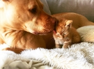 Его хозяйка забрала с приюта трехмесячным щенком. С тех пор и он сам помогает тому, кто нуждается в защите. Его подопечным стало крошечный рыжей котенок из приюта.