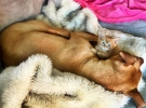 Через несколько часов после знакомства в своем новом доме, котенок уснул на Бубба. Он моет языком ее, как ребенка, и ложится так, чтобы было ее удобно. Им двоим, безусловно, очень весело расти вместе.