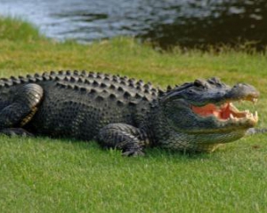 В американском штате Флорида огромный аллигатор прогуливался по полю для гольфа.