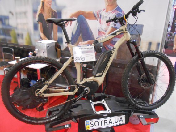 Один из самых дешевых великов выставки - Vitality Dice. Имеет 9 скоростей, переднюю вилку с амортизатором и электродвигатель мощностью 250 Ватт. Стоит Веломашина более 53 тыс. грн.