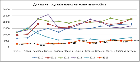Четвертый квартал стал наиболее успешным для автодилеров, продажи не опускались ниже 5 тыс. автомобилей. Минимальные продажи за последний квартал были отмечены в ноябре, когда свои первые номера получили 5144 легковушек. В последний месяц 2015 года украинцы приобрели и зарегистрировали 5 419 автомобилей или на 29% меньше, чем в прошлом году.
