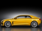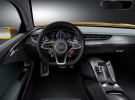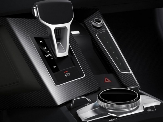 Интерьер Audi Sport Quattro Concept включает в себя обычный спортивный руль с классическими элементами управления мультимедийной системой, яркий центральный дисплей, кожаные и углепластиковые элементы отделки торпедо, сидений и дверных карт.