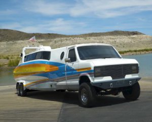 В заднюю часть минивэна "вмонтировали" моторную лодку с жилой зоной. В общем, все транспортный комплекс формирует гармоничную конструкцию. Фургон остается на суше, а катер отделяется и спускается на воду. Водный транспорт спускают на воду с помощью лебедки.