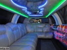 Крыша машины обтянута кожей. Между боковыми окнами установлены фонари с синей подсветкой. В салоне автомобиля - три кожаных дивана, бар и зеркальный потолок с разноцветной подсветкой.