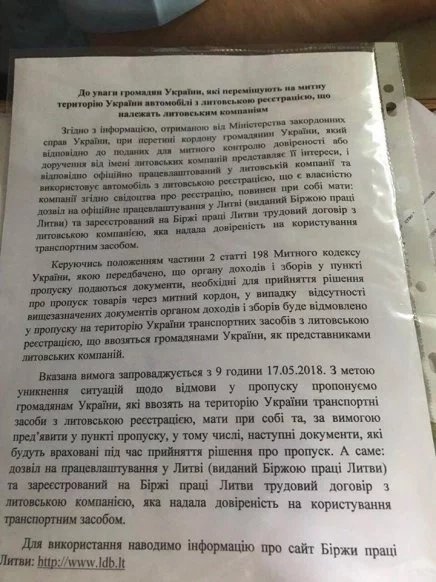 С сегодняшнего дня автомобили с литовской регистрацией, зарегистрированные на юридических лиц, будут пропускать в Украину только в случае предъявления лицом, что ввозит автомобиль, дополнительных документов, а именно: