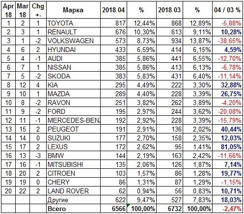 "Лидером продаж стала Toyota, заняв 12,4% украинского авторынка. На второе место вышла Renault, опередив Volkswagen. В топ-5 популярных брендов зашел и Hyundai, с результатом 6,6% рынка. А замыкает "пятерку" в апреле Audi", - отметили в ведомстве.