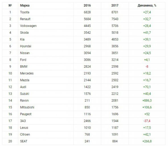 В 1-ю пятерку вошла чешская Skoda (5 тыс. проданных авто) и южнокорейская Kia (4,8 тыс.).