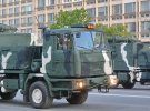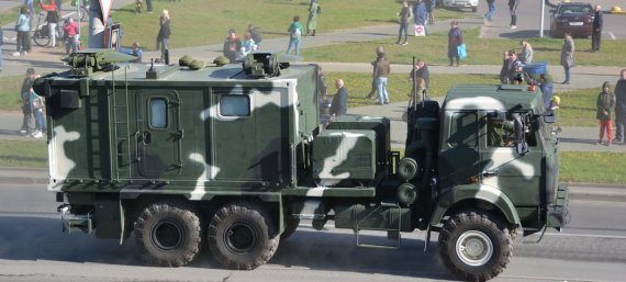 На параде присутствовала боевая машина зенитного ракетного комплекса "Оса" на шасси МАЗ-6317 зовется 9А33-2Б. За кабиной грузовика — отсек управления зенитным комплексом, с помощью которого можно тренироваться.