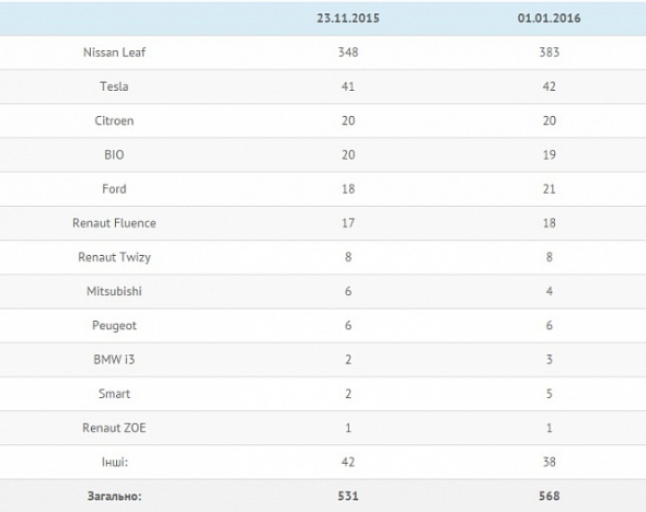 Кроме этого, в Украине зарегистрировали 21 электромобиль марки Ford, 20 Citroen, 19 BIO auto, 18 Renaut, 5 Smart и 6 Peugeot.