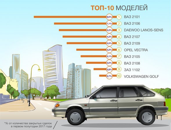 Самые популярные среди покупателей модели - ВАЗ. На первом месте - ВАЗ 2101 (9%). В народе этот автомобиль называют "копейка". На втором месте оказался ВАЗ 2106 - 7,1%.