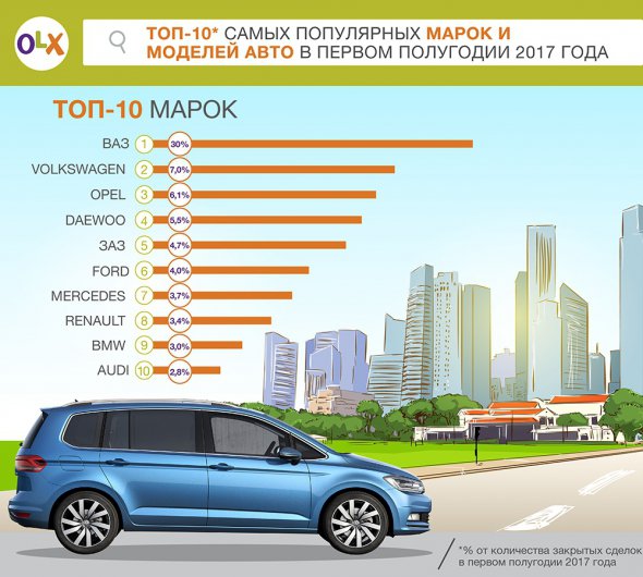 Самая популярная марка авто среди покупателей - ВАЗ - 30%. На втором месте - немецкие Volkswagen (7%) и Opel - (6,1%).