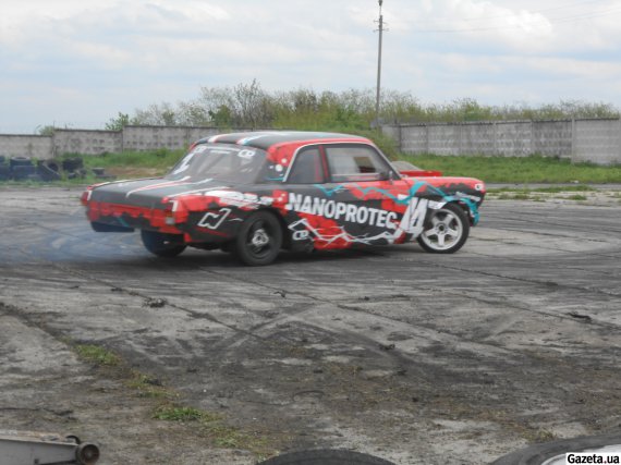 Металлическое ограждение у ангара обступили люди по всей длине, подходят еще. Чем ближе к локации - тем выше в воздухе концентрация стойкого запаха жженой резины. Вдруг все стихает. 2 молодых мужчин возятся у задней ступицы "Волги". Машина декорирована в основном красными и черными цветами. Двухдверная, кузов усиленный металлической конструкцией. Несколько минут и очередной комплект колес установлен. Из толпы выходит молодой человек в черной кепке. Взгляд направлен вниз. Его сажают на пассажирское кресло. Водитель фиксирует специальные, усовершенствованные ремни безопасности, дергает их и берется к рулю. С "диким" ревом двигателя ГАЗ срывается с места и заходит в затяжной дрифт. Автомобиль выписывает овальные фигуры, круги, восьмерки. От пробуксовки и трения шин колеса дымятся. На бетонных аэродромных плитах остаются следы от колес. Кое-где валяются куски разрушенных покрышек.