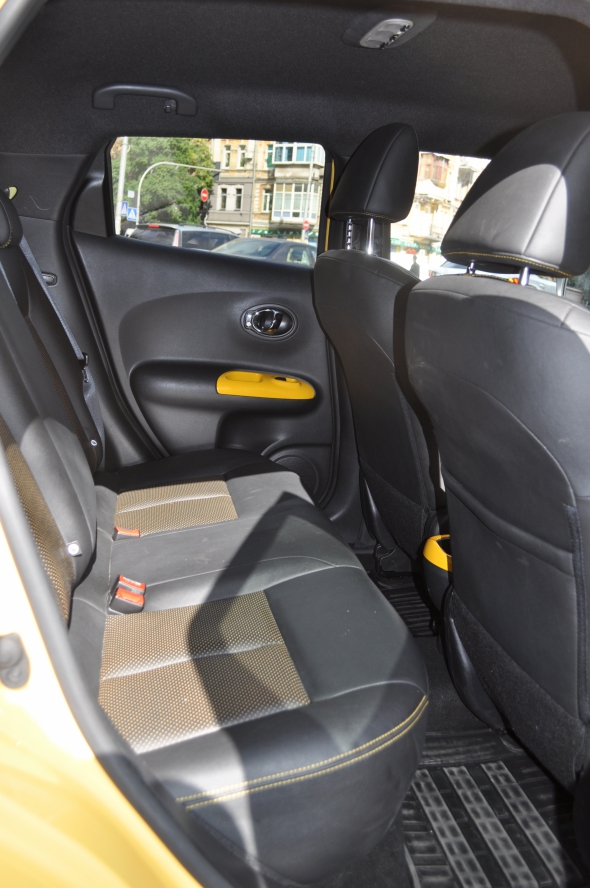 Дизайн салона автомобиля стал более выразительным за счет вставок цвета кузова. В нашей версии кроссовера тоннель трансмиссии, отделка вокруг дефлекторов воздуха торпеды и накладки на картах дверей желтые. Такого же цвета просрочка на кожаной обивке сидений.