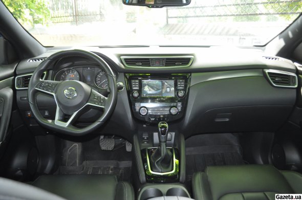 Зажимаю тормоза и касаюсь кнопки запуска двигателя - машина заводится. Водительское кресло подвигает меня ближе к рулю, зеркала открываются. Перевожу рычаг коробки передач в режим "драйв" и отправляюсь. Педаль газа чувствительная, автомобиль быстро ускоряется. Обод руля стал толще, диаметр - меньше, напоминает рулевое колесо спортивного автомобиля. В общем управления нового Qashqai точнее, чем до рестайлинга. Подвеска - жестче.