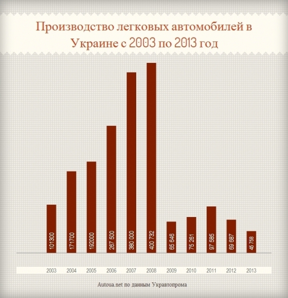 В 2013 году украинские автозаводы выпустили 45 758 автомобилей, что на 34% меньше, чем в 2012 году и в 9 раз меньше, чем в докризисном 2008 году. 2013 год стал худшим за последние 11 лет.