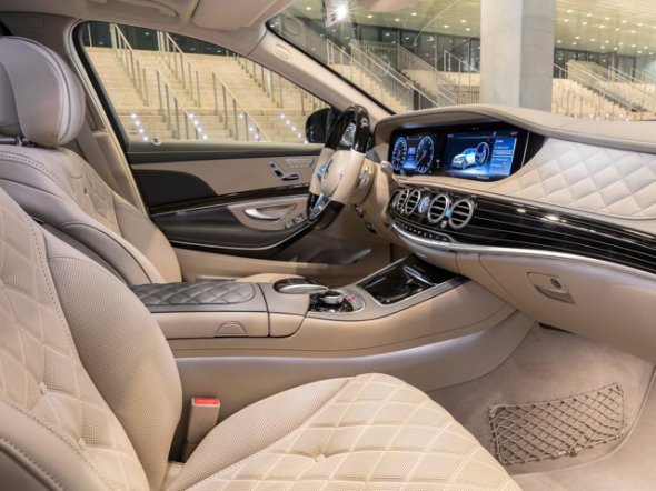 В Mercedes-Maybach S560 установили 4-литровый V8 твин-турбо на 470 л. с. Разгоняется машина до 100 км/ч за 4,9 сек. Укомплектована электроприводом сидений, вентиляцией, массажем, климат-контролем, мощной аудиосистемой и дисплеем для задних пассажиров.
