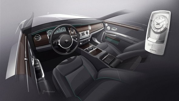 Салон украсят кожей. Карманы в передних и задних дверях обработают кожей с вкраплениями из серебра. На передней панели, деревянной обшивке на внутренней стороне двери и в багажнике появятся вставки из серебра и серебряная пластина с фирменным клеймом RR.