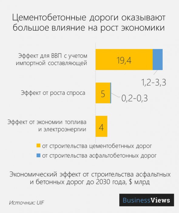 Бетонные дороги имеют положительный эффект на экономику: снижается импорт битума, растет спрос на украинский цемент, падает потребление топлива, снижаются расходы на освещение дорог из-за лучшей отражательной способности бетона.