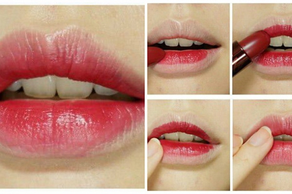Второй вариант - воспользуйтесь двумя оттенками помады. Светлый вбейте пальцем по контуру губ, темный - по центру. Этот прием создает модный эффект поцелуя и делает губы визуально более пухлыми.