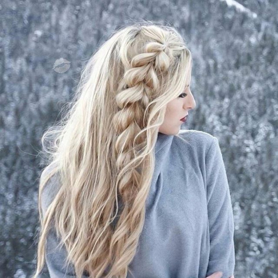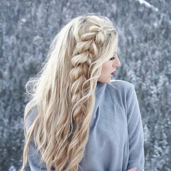 Немного подкрутите пряди на плойку. Расшевелите их. С одной стороны заплетите косу и вытяните локоны. Конец закрепите бесцветной резинкой.