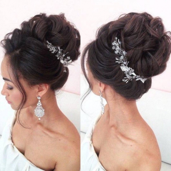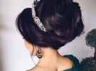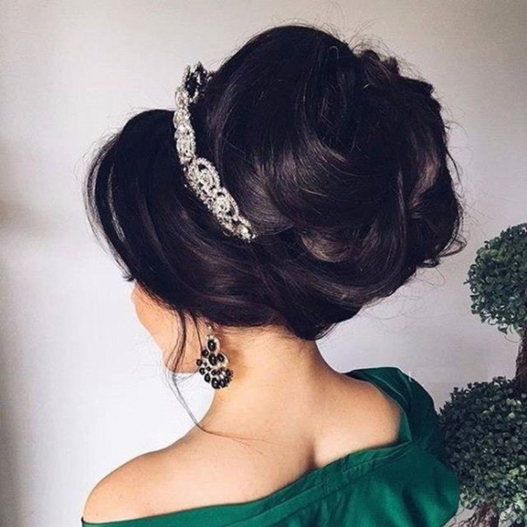 Для праздничного образа сделайте высокую прическу с начесом или пышную косу, закрепленную снизу. Наденьте ободок украшенный камнями.
