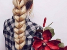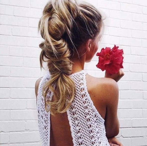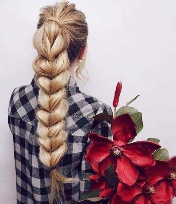 Завяжите волосы в хвост. Сделайте косу. Вытяните кудри так, чтобы сделать ее объемной и тяжелой.