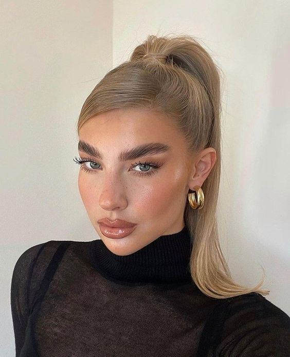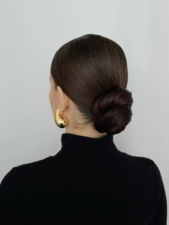 Подойдет девушкам с любой шевелюрой. Зачешите волосы назад и завяжите в пучок. Зафиксируйте прическу лаком.