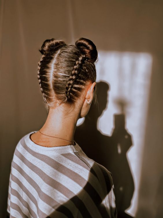Заплетите две косички начиная с затылка, а сверху закрутите их в пучки.