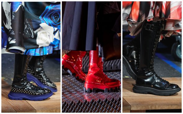 5. Грубая обувь. Ботинки на грубой, массивной подошве, со шнуровкой, высотой до колена. В комплекте с нежным, романтичным платьем, женственной юбкой или даже широкими брюками, которые будут тоже в тренде, ботинки заиграют совершенно новыми оттенками.