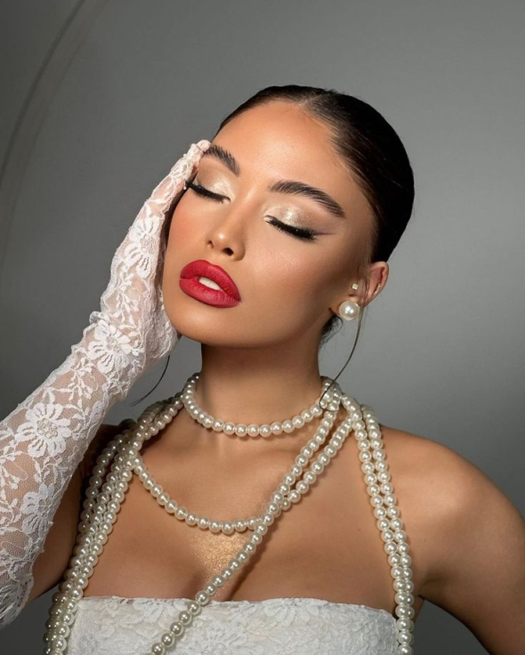 Универсальный макияж, который подойдет как для классического костюма, так и для золотого комбинезона или короткого платья. Помните, используя красную помаду, тени для век следует выбирать не ярких цветов. Чтобы не выглядеть вульгарно, выбирайте персиковые, бежевые или коричневые оттенки. Наносите тени таким образом, чтобы создать эффект легкого дыма.