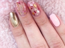 Поклонницам романтических дизайнов на ногтях мастера предлагают использовать засушенные цветы. На слой однотонного покрытия накладывается гербарий в миниатюрном размере. Такие растения создают из жатой цветной бумаги.