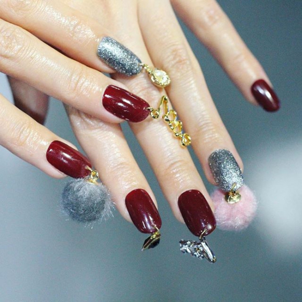 Первым вариантом является сочетание цветов и аксессуаров. Мастер использовала серебристые и бордовые оттенки. Несколько пальцев украсила кулонами в виде спиралей, камней, пушистых слоев. Цепляются на ногти через маленькое кольцо.