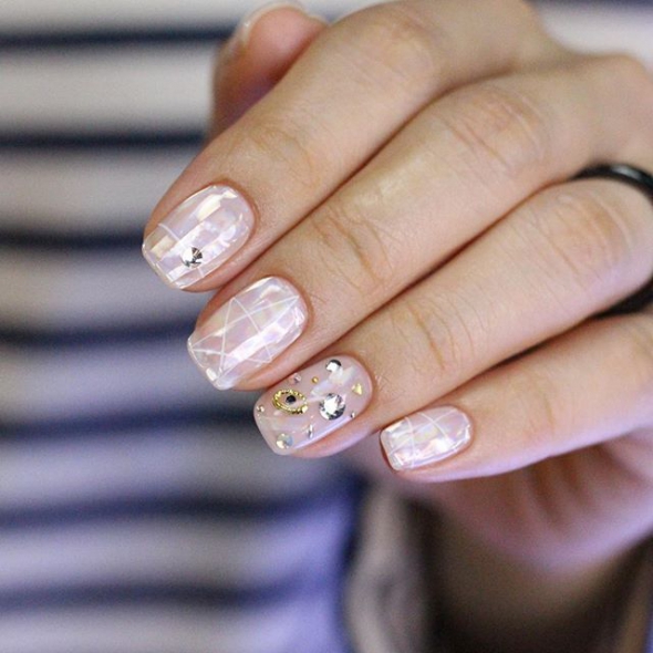 Если ваш новогодний образ тяготеет к нежности, обратите внимание на четвертый вариант. Ногтевая пластина покрывается почти прозрачным лаком с едва заметным бежевым оттенком и двойным блеском. Ногти разрисовываются тонкими геометрическим линиям. На каждом разный рисунок. Избранные ногти украшаются декором - камнями, стразами, цепочками.