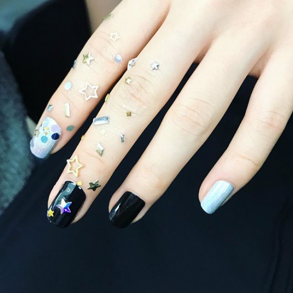 Любительницам черного понравится второй вариант. Опять в паре с серебристым. После покраски цветом, на указательный и средний пальцы накладываются миниатюрные звезды, камни и стразы. Декором посыпается ноготь и сам палец.