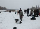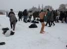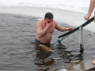 Через 7 минут Петр Мартынюк подошел ближе к проруби, разделся прямо на льду. Две пары носков оставил на желтом пакете."Отвернитесь, я" галстук "сниму. Это мы так плавки называем. Потому что примерзают к телу. Лучше без них", - отметил Петр Иванович.