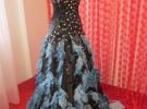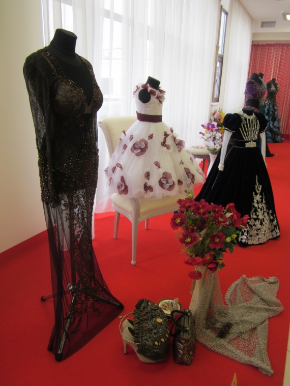 "Некоторые звезды берут платья в рекламных целях, - рассказывает Ольтга Музыченко. - На время фотосессии берут платья. Есть два платья черных - Ольги Сумской, она в свое время в них появлялась на мероприятиях, это его собственность. Платья, бывает, весят 10 килограмм и более. Здесь если камни - то камни Сваровски, если шелк - то только натуральный, если перья, то, поверьте, не из курицы ".