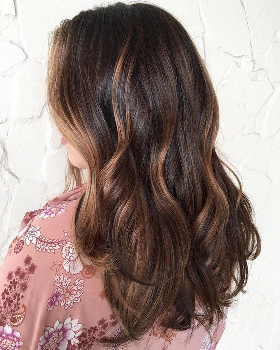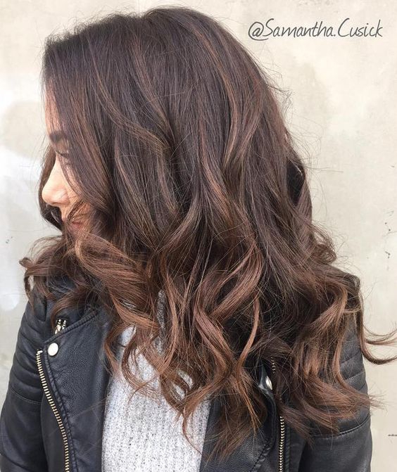 Шоколадный цвет оттеняется едва заметными светлыми прядями. Будто волосы выгорели на солнце. Это придает прическе фактурность.