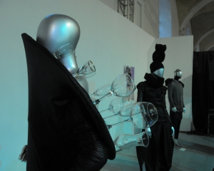 На экспозиции "Грани тела", которая проходит в рамках 29-го Ukrainian Fashion Week, представлена ??первая работа Алексея Залевского - платье с бокалами, которую он создал в 1994 году.