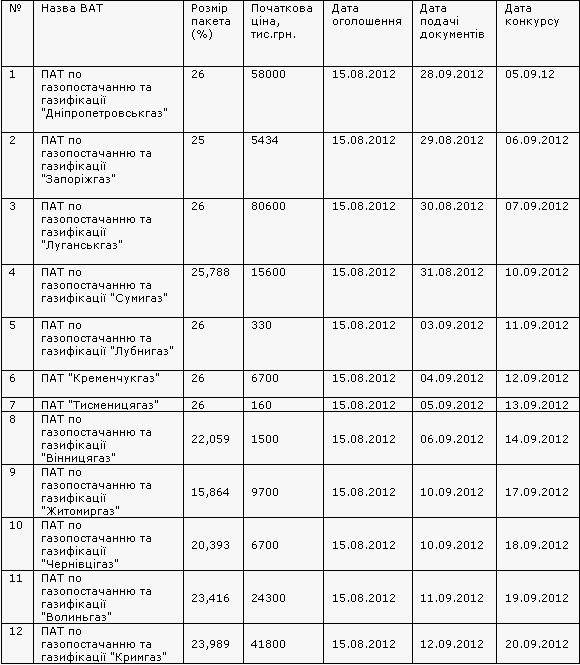 Так, на продажу виставлены ОАО "Днепропетровскгаз", "Запорожгаз", "Луганскгаз", "Сумыгаз", "Лубныгаз", "Кременчуггаз", "Тисменицагаз", "Винницагаз", "Житомиргаз", "Черновцыгаз", "Волыньгаз" , "Крымгаз".