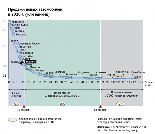 Эксперты прочат, что доля 15 крупнейших рынков вне БРИК, с показателем продаж более 400 000 новых машин в год, дойдет до 71%. Среди них - Индонезия, Южная Корея, Иран, Таиланд и Украина.