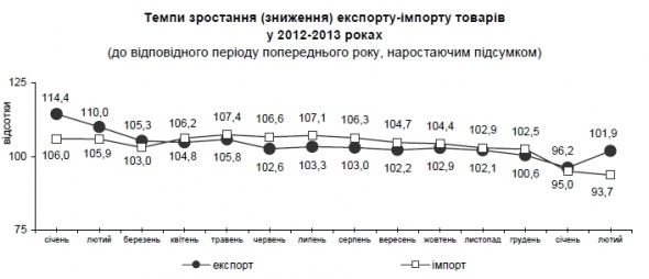 Отрицательное сальдо внешней торговли товарами в январе-феврале в Украине составило $902,9 млн, что примерно вдвое меньше, чем за аналогичный период 2012 года (-$1 млрд 862,8 млн).