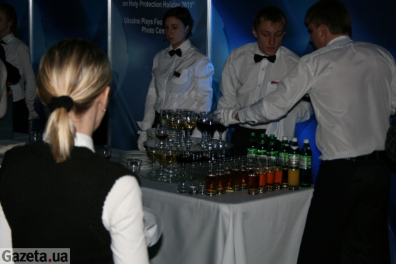По углам зала – столы с традиционными для таких событий бутербродно-десертными закусками, изюминкой среди которых оказались малина, клубника и смородина. Ну и, естественно, выпивка – вина, соки, минералка. Официанты на подносах разносят водку в рюмках.
