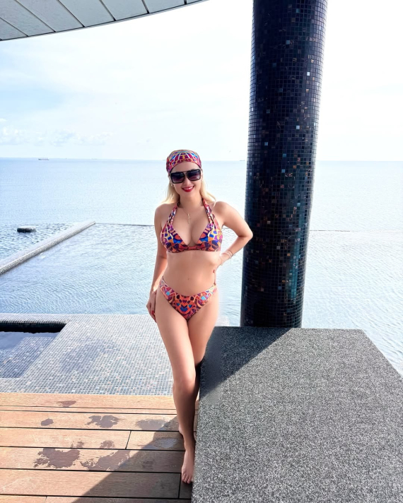 В своем Instagram артистка опубликовала кадры, где позировала у бассейна на фоне моря.